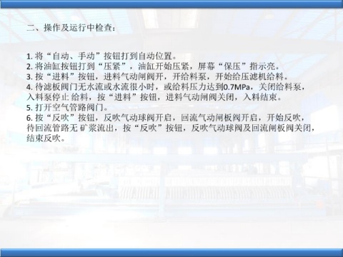 4. 待濾板閥門無水流或水流很小時,或給料壓力達到0.7MPa,關閉給料泵,