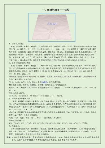 度(g/d):438,溶化點(℃):238·240,熔化點(℃):255 一 260。比重:1.38。濾布分類:滌綸長纖濾布,滌綸
