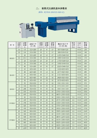 型  號     麵積     容量      濾板尺寸        厚度     數量     厚度       整機外形尺寸           功率     壓力      質量